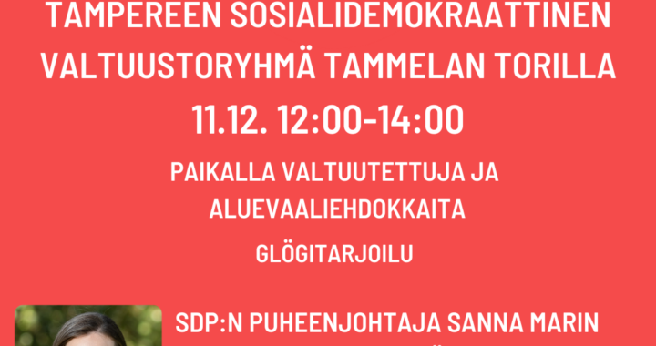 Tampereen Sosialidemokraattinen Valtuustoryhmä tarjoaa glögiä Tammelan torilla lauantaina 11.12.2021 kello 12:00-14:00 välisen ajan.