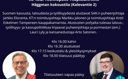 Mistä eväät talouskasvuun? Ke 15.2. Technopolis Yliopistonrinne, Häggman kokoustila (Kalevantie 2) Suomen kasvusta, taloudesta ja työllisyydestä alustavat SAK:n puheenjohtaja Jarkko Eloranta, KT:n toimitusjohtaja Markku Jalonen ja toimitusjohtaja Antti Eskelinen Tampereen kauppakamarista. Alustusten pohjalta tulevaa talous-, työllisyys- ja kasvupolitiikkaa linjaavat puheenjohtaja ja pormestari (em.) Lauri Lyly ja kansanedustaja Arto Satonen. Klo 16:oo kahvi Klo 16:30 alustukset […]